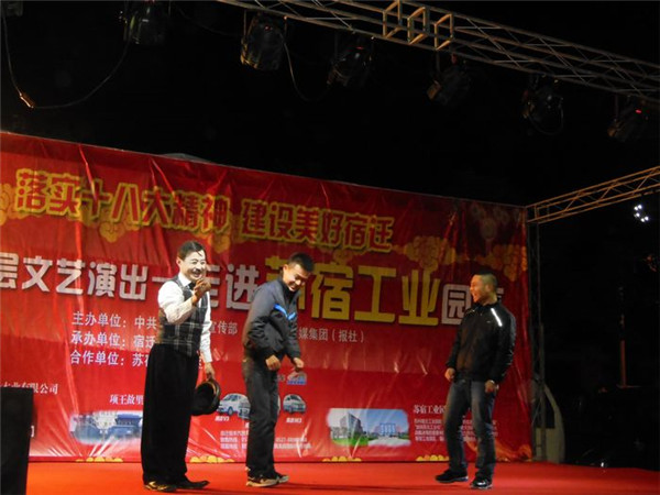 落實十八大精神 建設美好宿遷”服務基層文藝演出由市委宣傳部、宿遷報業(yè)傳媒集團(報社)主辦,宿遷新聞網(wǎng)承辦,旨在深入宣傳黨的十八大和市委四屆三次全體(擴大)會議精神,落實文化惠民措施,將走進全市100余個鄉(xiāng)鎮(zhèn)、社區(qū),將包括歌舞、雜技、曲藝、戲劇等內(nèi)容的百場精彩演出奉獻給廣大基層群眾,此次受園區(qū)邀請,專程赴園區(qū)公舍演出,為廣大工友及周邊居民帶來了一場精彩的文化大餐。