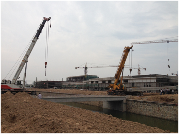 近日,在開發(fā)公司的積極推進下,可發(fā)科技廠區(qū)內4座橋梁中的2#橋單跨20m空心梁板正式開始吊裝。