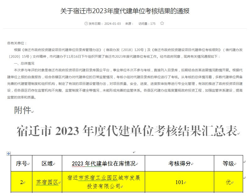 近日,經(jīng)市政府同意,由宿遷市政府投資建設項目代建管理辦公室通報宿遷市2023年度代建單位考核工作結(jié)果,城發(fā)公司以101分高分通過本次考核。