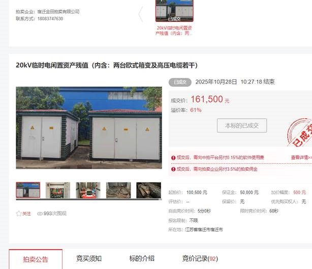 近日,城發(fā)公司青年公寓臨時電項目一批閑置資產(chǎn)在中拍平臺公開拍賣,經(jīng)過27分鐘的緊張激烈競價,最終以161500元成交標(biāo)的,比評估價100500元高出61000元,溢價率61%。