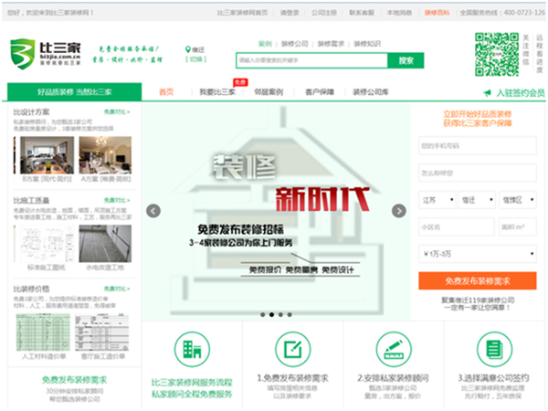 比三家裝修網(wǎng)于2015年10月份落戶蘇宿電子商務產(chǎn)業(yè)園,該裝修網(wǎng)定位于“互聯(lián)網(wǎng)+”大眾創(chuàng)業(yè)平臺,是一家扎根于三線城市,以“中介生意”模式幫助傳統(tǒng)的裝修行業(yè)的公司利用互聯(lián)網(wǎng)接到更多的訂單,幫助用戶找到合適的裝修公司。網(wǎng)站通過好品質(zhì)裝修,比設計方案、比施工質(zhì)量、比裝修價格,為用戶提供符合比三家裝修網(wǎng)標準的服務。