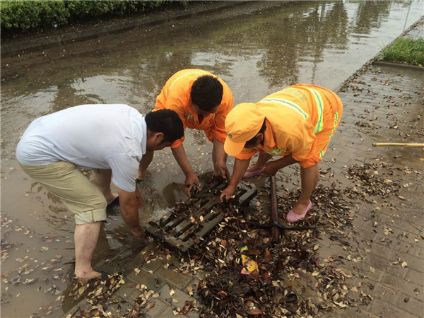 市政搶險(xiǎn)疏通小組迅速調(diào)集人員及物資力量,開展區(qū)內(nèi)泄洪及排水工作。公舍等項(xiàng)目為迅速排澇,員工在水中冒雨架好水泵,安裝吸水管,鋪設(shè)排水水帶,發(fā)動(dòng)機(jī)器快速排水,使公舍車庫(kù)等水位快速下降。