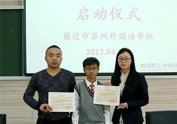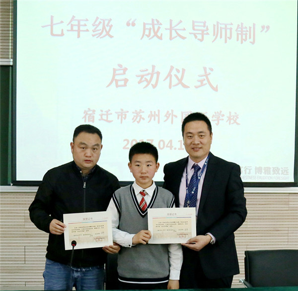 近日,宿遷市蘇州外國語學校七年級16位孩子和他們的家長監(jiān)護人還有他們新認的“干爹”“干媽”齊聚學校階梯教室,舉行隆重的簽約儀式。這些“干爹”“干媽”是學校給首批孩子們配的成長導(dǎo)師,每位教師與一個孩子結(jié)對,全方位關(guān)心孩子的成長,陪伴孩子們一起度過快樂而充實的初中生活,力求“個個進步,人人成星”?!俺砷L導(dǎo)師制”這種親情化、個性化、人本化的育人模式,是宿蘇外實施素質(zhì)教育,提升教育核心競爭力的需要;是宿蘇外服務(wù)家長,擴大教育品牌影響力的需要;是宿蘇外回報社會,落實“兩聚一高”,建設(shè)和諧社會的需要。